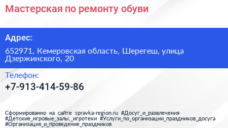 Мастерская по ремонту обуви по адресу 652971, Кемеровская область, Шерегеш, улица Дзержинского, 20 в дальнейшем Организация, размещена в следующих категориях:
