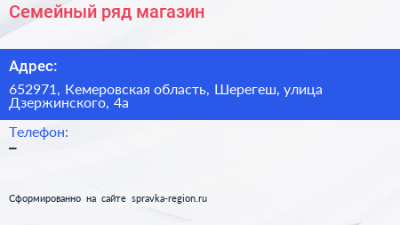 Семейный ряд, магазин по адресу 652971, Кемеровская область, Шерегеш, улица Дзержинского, 4а в дальнейшем Организация, размещена в следующих категориях: