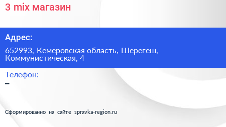 3 mix, магазин по адресу 652993, Кемеровская область, Шерегеш, Коммунистическая, 4 в дальнейшем Организация, размещена в следующих категориях: