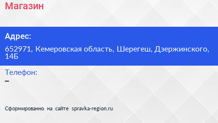 Магазин по адресу 652971, Кемеровская область, Шерегеш, Дзержинского, 14Б в дальнейшем Организация, размещена в следующих категориях: