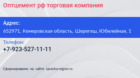 Оптцемент.рф, торговая компания по адресу 652971, Кемеровская область, Шерегеш, Юбилейная, 1 в дальнейшем Организация, размещена в следующих категориях: