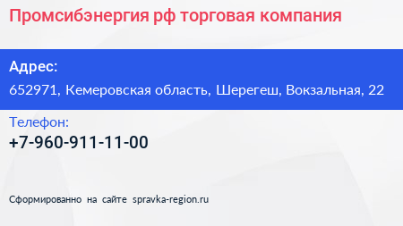 Промсибэнергия.рф, торговая компания по адресу 652971, Кемеровская область, Шерегеш, Вокзальная, 22 в дальнейшем Организация, размещена в следующих категориях: