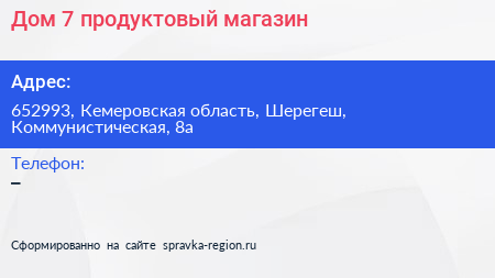 Дом 7, продуктовый магазин по адресу 652993, Кемеровская область, Шерегеш, Коммунистическая, 8а в дальнейшем Организация, размещена в следующих категориях: