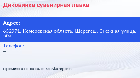 Диковинка, сувенирная лавка по адресу 652971, Кемеровская область, Шерегеш, Снежная улица, 50а в дальнейшем Организация, размещена в следующих категориях: