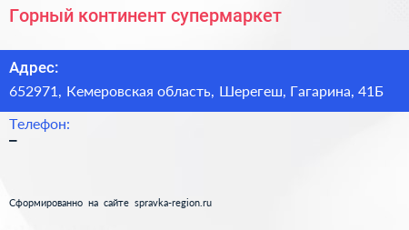 Горный континент, супермаркет по адресу 652971, Кемеровская область, Шерегеш, Гагарина, 41Б в дальнейшем Организация, размещена в следующих категориях: