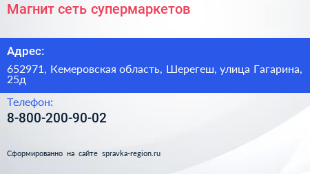 Магнит, сеть супермаркетов по адресу 652971, Кемеровская область, Шерегеш, улица Гагарина, 25д в дальнейшем Организация, размещена в следующих категориях: