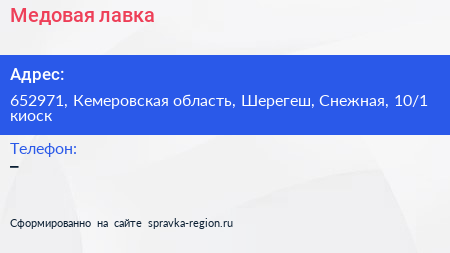 Медовая лавка по адресу 652971, Кемеровская область, Шерегеш, Снежная, 10/1 киоск в дальнейшем Организация, размещена в следующих категориях: