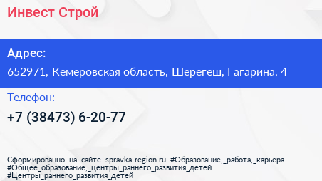Инвест-Строй по адресу 652971, Кемеровская область, Шерегеш, Гагарина, 4 в дальнейшем Организация, размещена в следующих категориях: