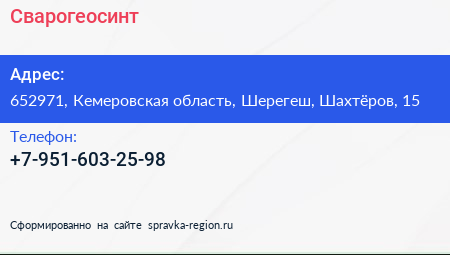 Сварогеосинт по адресу 652971, Кемеровская область, Шерегеш, Шахтёров, 15 в дальнейшем Организация, размещена в следующих категориях: