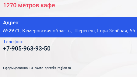 1270 метров, кафе по адресу 652971, Кемеровская область, Шерегеш, Гора Зелёная, 55 в дальнейшем Организация, размещена в следующих категориях:
