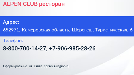 ALPEN CLUB, ресторан по адресу 652971, Кемеровская область, Шерегеш, Туристическая, 6 в дальнейшем Организация, размещена в следующих категориях:
