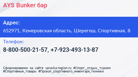 AYS Bunker, бар по адресу 652971, Кемеровская область, Шерегеш, Спортивная, 8 в дальнейшем Организация, размещена в следующих категориях: