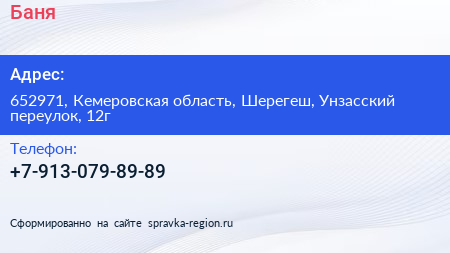 Баня по адресу 652971, Кемеровская область, Шерегеш, Унзасский переулок, 12г в дальнейшем Организация, размещена в следующих категориях: