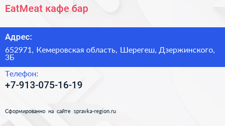 EatMeat, кафе-бар по адресу 652971, Кемеровская область, Шерегеш, Дзержинского, 3Б в дальнейшем Организация, размещена в следующих категориях: