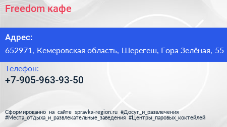 Freedom, кафе по адресу 652971, Кемеровская область, Шерегеш, Гора Зелёная, 55 в дальнейшем Организация, размещена в следующих категориях: