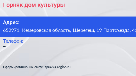 Горняк, дом культуры по адресу 652971, Кемеровская область, Шерегеш, 19 Партсъезда, 4а в дальнейшем Организация, размещена в следующих категориях: