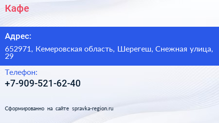 Кафе по адресу 652971, Кемеровская область, Шерегеш, Снежная улица, 29 в дальнейшем Организация, размещена в следующих категориях: