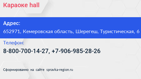 Караоке hall по адресу 652971, Кемеровская область, Шерегеш, Туристическая, 6 в дальнейшем Организация, размещена в следующих категориях: