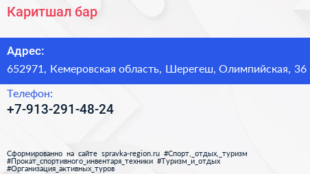 Каритшал, бар по адресу 652971, Кемеровская область, Шерегеш, Олимпийская, 36 в дальнейшем Организация, размещена в следующих категориях: