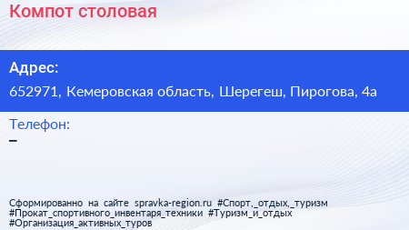 Компот, столовая по адресу 652971, Кемеровская область, Шерегеш, Пирогова, 4а в дальнейшем Организация, размещена в следующих категориях: