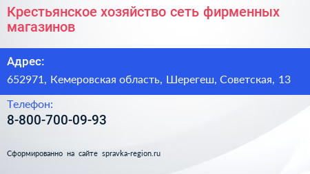 Крестьянское хозяйство, сеть фирменных магазинов по адресу 652971, Кемеровская область, Шерегеш, Советская, 13 в дальнейшем Организация, размещена в следующих категориях: