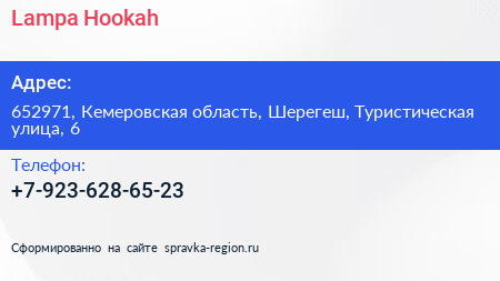 Lampa Hookah по адресу 652971, Кемеровская область, Шерегеш, Туристическая улица, 6 в дальнейшем Организация, размещена в следующих категориях: