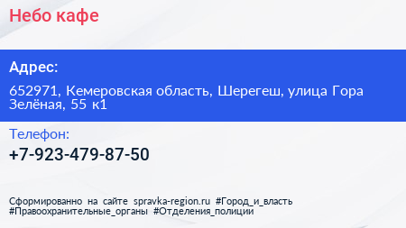 Небо, кафе по адресу 652971, Кемеровская область, Шерегеш, улица Гора Зелёная, 55 к1 в дальнейшем Организация, размещена в следующих категориях: