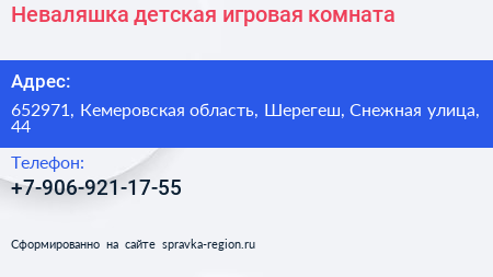 Неваляшка, детская игровая комната по адресу 652971, Кемеровская область, Шерегеш, Снежная улица, 44 в дальнейшем Организация, размещена в следующих категориях: