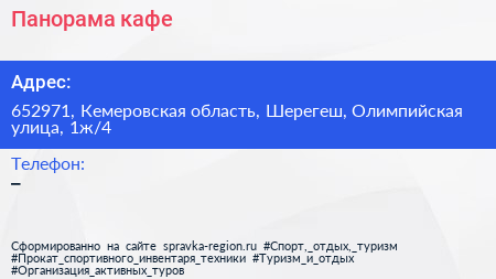 Панорама, кафе по адресу 652971, Кемеровская область, Шерегеш, Олимпийская улица, 1ж/4 в дальнейшем Организация, размещена в следующих категориях: