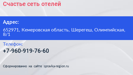Счастье, сеть отелей по адресу 652971, Кемеровская область, Шерегеш, Олимпийская, 8/1 в дальнейшем Организация, размещена в следующих категориях: