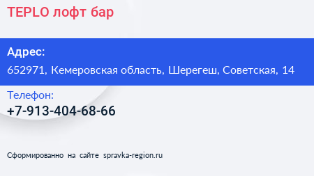 TEPLO, лофт-бар по адресу 652971, Кемеровская область, Шерегеш, Советская, 14 в дальнейшем Организация, размещена в следующих категориях: