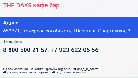 THE DAYS, кафе-бар по адресу 652971, Кемеровская область, Шерегеш, Спортивная, 8 в дальнейшем Организация, размещена в следующих категориях: