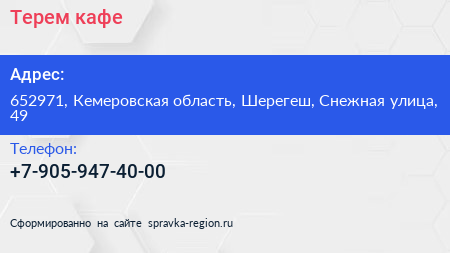 Терем, кафе по адресу 652971, Кемеровская область, Шерегеш, Снежная улица, 49 в дальнейшем Организация, размещена в следующих категориях: