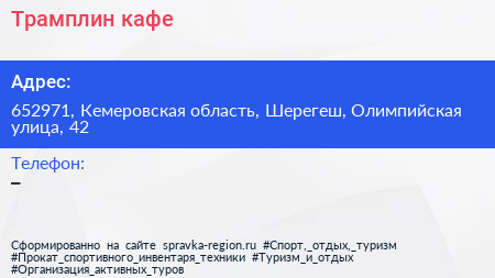 Трамплин, кафе по адресу 652971, Кемеровская область, Шерегеш, Олимпийская улица, 42 в дальнейшем Организация, размещена в следующих категориях: