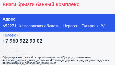 Визги-брызги, банный комплекс по адресу 652971, Кемеровская область, Шерегеш, Гагарина, 9/1 в дальнейшем Организация, размещена в следующих категориях: