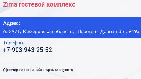 Zima, гостевой комплекс по адресу 652971, Кемеровская область, Шерегеш, Дачная 3-я, 949а в дальнейшем Организация, размещена в следующих категориях: