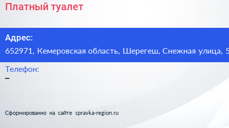 Платный туалет по адресу 652971, Кемеровская область, Шерегеш, Снежная улица, 5 в дальнейшем Организация, размещена в следующих категориях: