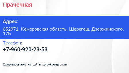 Прачечная по адресу 652971, Кемеровская область, Шерегеш, Дзержинского, 17Б в дальнейшем Организация, размещена в следующих категориях: