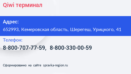 Qiwi, терминал по адресу 652993, Кемеровская область, Шерегеш, Урицкого, 41 в дальнейшем Организация, размещена в следующих категориях: