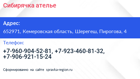 Сибирячка, ателье по адресу 652971, Кемеровская область, Шерегеш, Пирогова, 4 в дальнейшем Организация, размещена в следующих категориях: