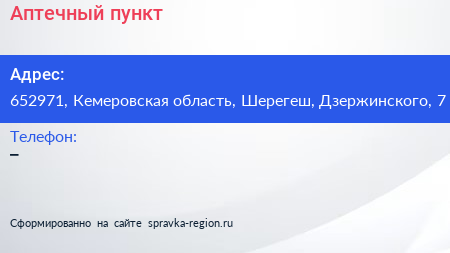 Аптечный пункт по адресу 652971, Кемеровская область, Шерегеш, Дзержинского, 7 в дальнейшем Организация, размещена в следующих категориях: