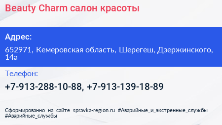 Beauty-Charm, салон красоты по адресу 652971, Кемеровская область, Шерегеш, Дзержинского, 14а в дальнейшем Организация, размещена в следующих категориях: