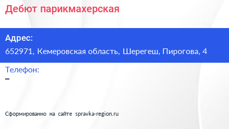 Дебют, парикмахерская по адресу 652971, Кемеровская область, Шерегеш, Пирогова, 4 в дальнейшем Организация, размещена в следующих категориях:
