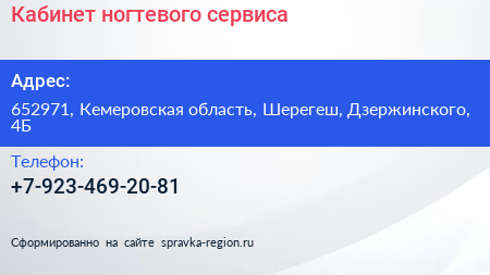 Кабинет ногтевого сервиса по адресу 652971, Кемеровская область, Шерегеш, Дзержинского, 4Б в дальнейшем Организация, размещена в следующих категориях: