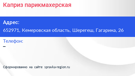 Каприз, парикмахерская по адресу 652971, Кемеровская область, Шерегеш, Гагарина, 26 в дальнейшем Организация, размещена в следующих категориях: