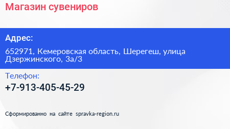 Магазин сувениров по адресу 652971, Кемеровская область, Шерегеш, улица Дзержинского, 3а/3 в дальнейшем Организация, размещена в следующих категориях: