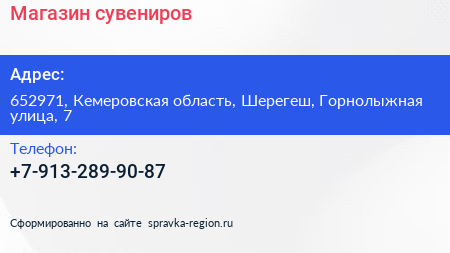 Магазин сувениров по адресу 652971, Кемеровская область, Шерегеш, Горнолыжная улица, 7 в дальнейшем Организация, размещена в следующих категориях:
