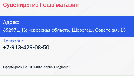 Сувениры из Геша, магазин по адресу 652971, Кемеровская область, Шерегеш, Советская, 13 в дальнейшем Организация, размещена в следующих категориях: