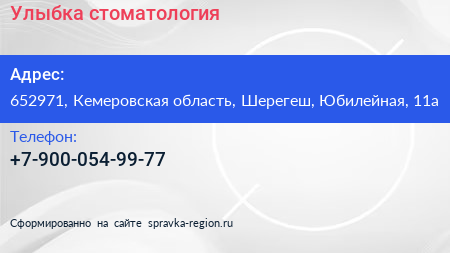 Улыбка, стоматология по адресу 652971, Кемеровская область, Шерегеш, Юбилейная, 11а в дальнейшем Организация, размещена в следующих категориях: