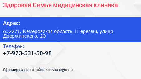 Здоровая Семья, медицинская клиника по адресу 652971, Кемеровская область, Шерегеш, улица Дзержинского, 20 в дальнейшем Организация, размещена в следующих категориях: